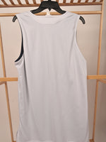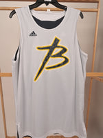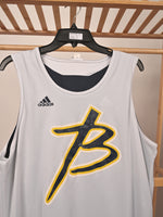 Brand: Adidas Color: White/Light Gray Style: Sleeveless basketball jersey/tank top Logo: A large black and yellow stylized "B" or "73" on the front Features: Black trim around the neck and armholes, and a small Adidas logo on the upper left...