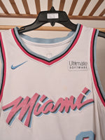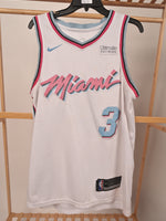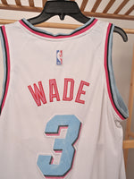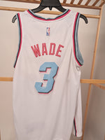 This is a Nike Miami Heat "Vice" City Edition jersey, associated with basketball player Dwyane Wade, who wore number 3. The jersey is white with pink, light blue, and black trim. The word "Miami" is written...