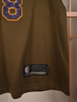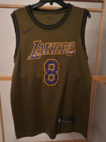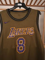 Team: Los Angeles Lakers Player: Kobe Bryant Number: 8 Color: Olive green (also referred to as "military green" or "Mamba Mentality") with purple and black trim. Design: The jersey features "LAKERS" across the chest in purple with a yellow outline,...