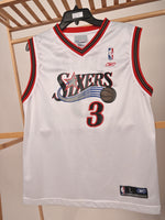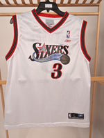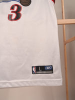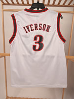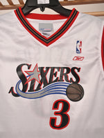 This is a white Reebok Allen Iverson Philadelphia 76ers basketball jersey, featuring the team name "SIXERS" and the player's number "3" on the front. The jersey has red, white, and blue trim around the neck and...