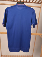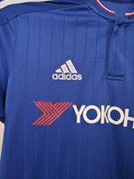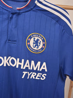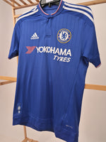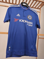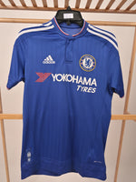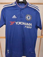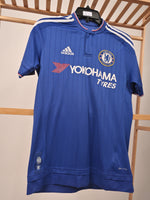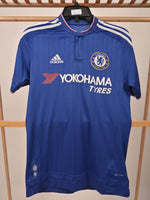 This official Adidas football shirt was worn by the Chelsea team during the 2015-2016 season. The jersey features a classic blue design with a V-neck collar and white and red trim. The front of the shirt displays the Chelsea crest and the sponsor logo for Yokohama Tyres. It was crafted with moisture-wicking fabric for comfort and breathability.
