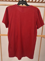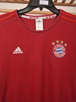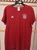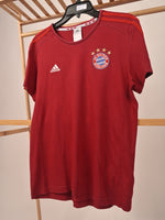 This is an Adidas FC Bayern Munich T-shirt or jersey. The shirt is red with the Adidas logo on the left chest and the FC Bayern Munich crest on the right. It features three red stripes on...